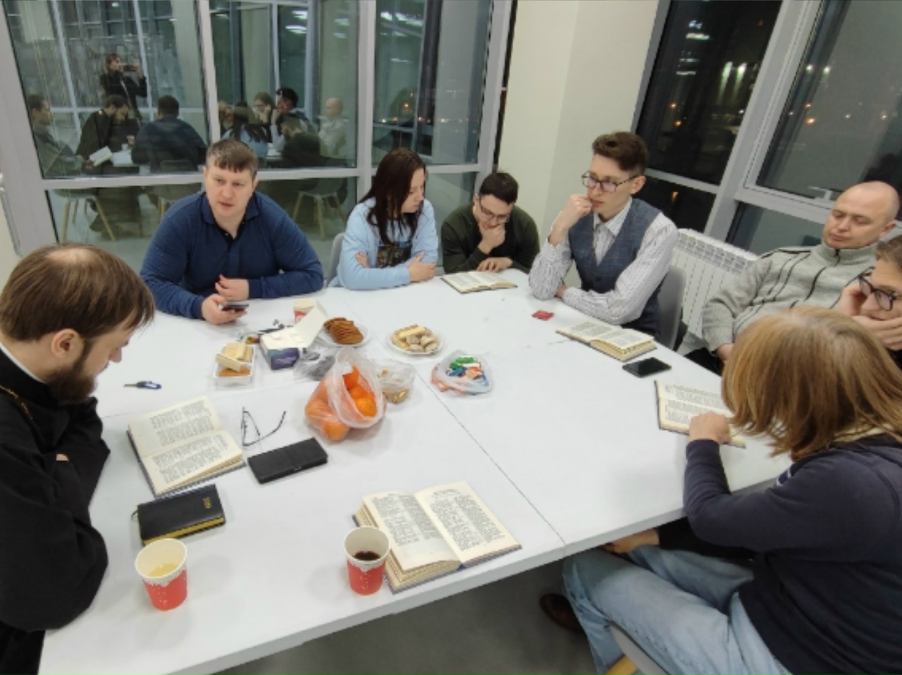 В марте участники Евангельских чтений начали изучать первое послание св. апостола Павла к Фессалоникийцам. Собравшись 9 марта в пространстве Цоколь, они прочитали первые три главы послания. Иерей Максим Артемьев рассказал о городе Салоники, составе и настроениях его жителей во дни проповеди апостола Павла на европейском континенте и обстоятельствах основания Фессалоникийской церкви. Особое внимание в клубе уделяется обстановке. Приходящих на встречу угощают чаем и кофе со сладостями. Каждый пришедший может свободно высказаться, задать священнику личные вопросы или предложить обсудить волнующую тему.